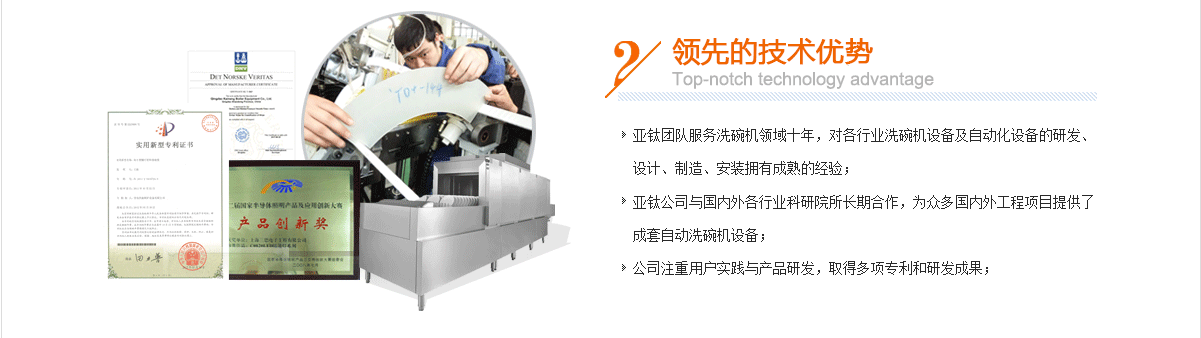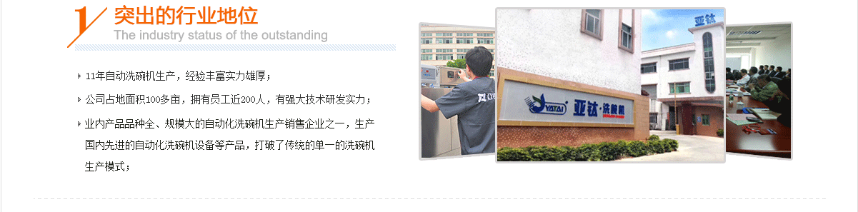 東莞市亞鈦自動化科技有限公司位于珠三角經(jīng)濟中心地帶的東莞,享譽“世界工廠”之稱,東莞亞鈦自動化科技有限公司是一家致力于商用洗碗機的研發(fā)、制造、項目投資運營管理一體化的高新技術(shù)企業(yè)。本公司率先引進歐盟、日本等多家國際先進技術(shù)及專業(yè)制作人才,使產(chǎn)品在生產(chǎn)工藝、產(chǎn)品質(zhì)量、洗滌效果等方面達到較高水平,形成了以物理處理為核心的產(chǎn)業(yè)化、集成化餐具清洗、消毒處理、包裝技術(shù),立足成為“商用洗碗機一體化運作名牌企業(yè)”。